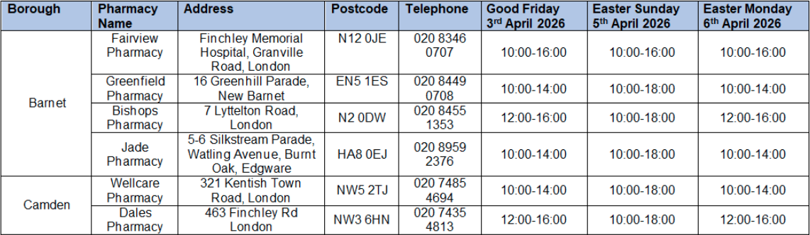 Pharmacy opening hours for Easter 2026 - Camden & Barnet
